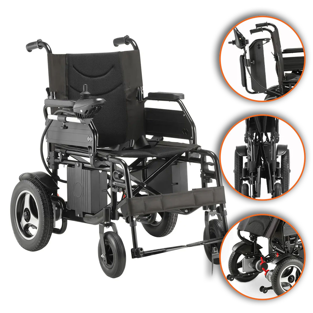 - Design compacto e dobrável: fácil transporte sem remover baterias.