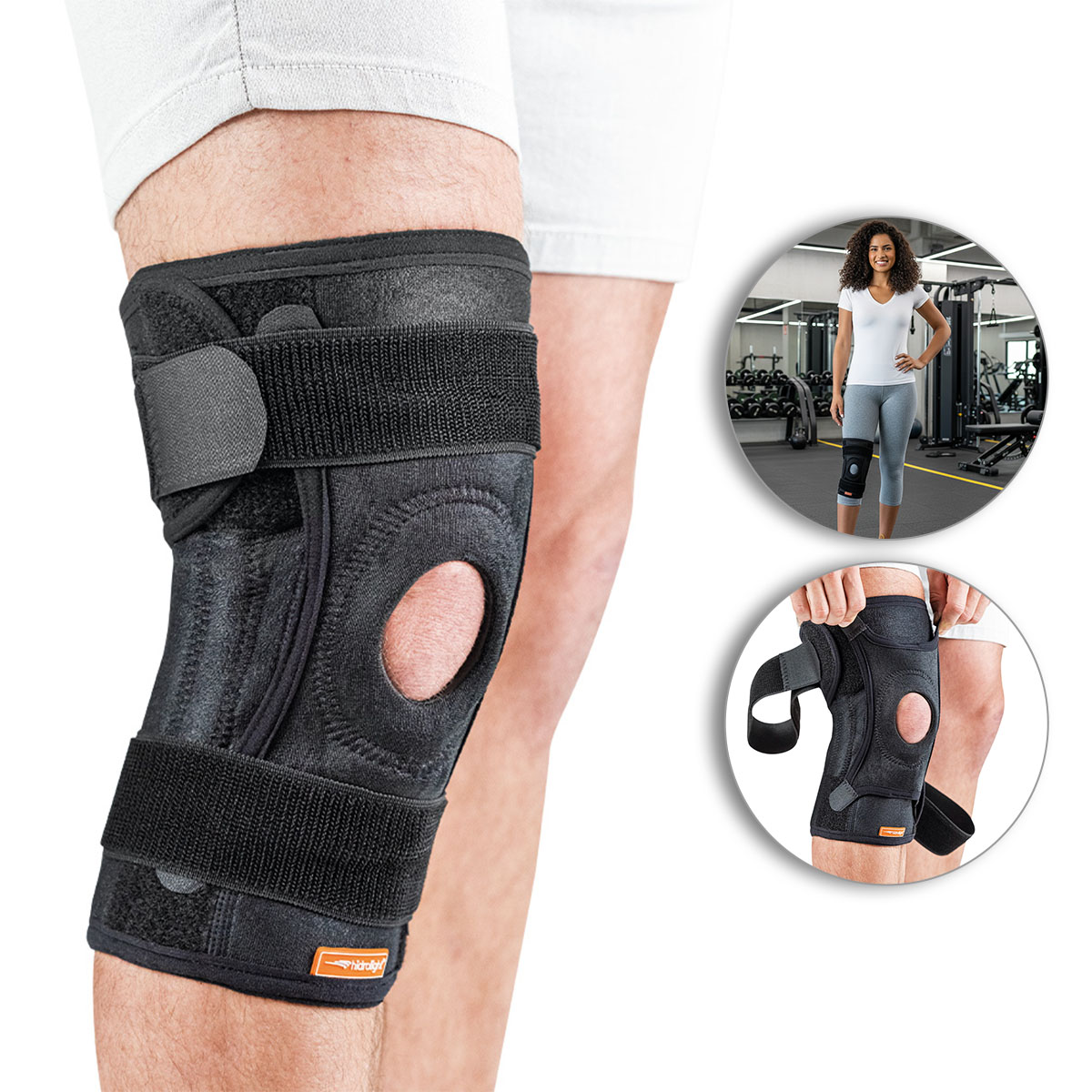 Com um sistema de ajuste patelar de 4 pontos, esta joelheira auxilia na compressão e no posicionamento correto da patela, enquanto seu orifício oval anatomicamente projetado proporciona um ajuste mais preciso, aumentando o alívio da tensão no tendão patelar. As 4 barbatanas flexíveis, duas de cada lado, oferecem estabilidade ao joelho sem limitar os movimentos naturais.