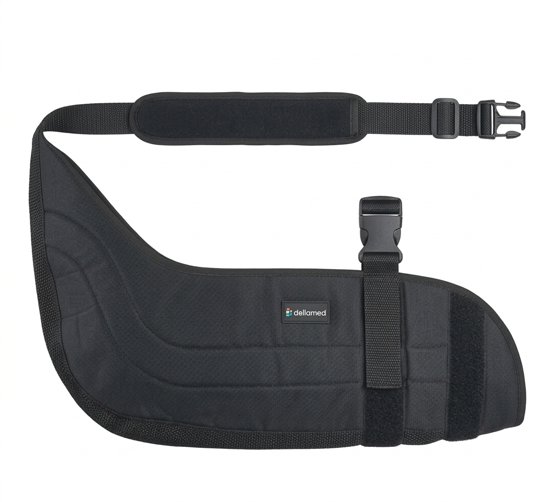 Indicada para imobilização do braço e ombro, a Tipoia Velpeau Ortho Care Dellamed é recomendada para casos de luxações, fraturas, lesões musculares, pós-operatório e recuperação de traumas, mantendo o membro superior estabilizado.